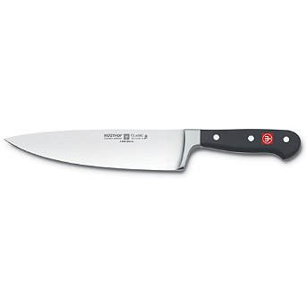 lifetime warranty. Full tang construction. Precision forged from a single piece of high-carbon, no-stain, surgical steel. High impact plastic handle. Full bolster for heft and balance. Our Wusthof Trident Classic 8" Cook's Knife is the hardest working knife in your kitchen. From chopping to slicing, this knife does it all. Lifetime warranty. . . . . Hand wash only — not dishwasher safe. Made in Germany. This item is ineligible for discounts.