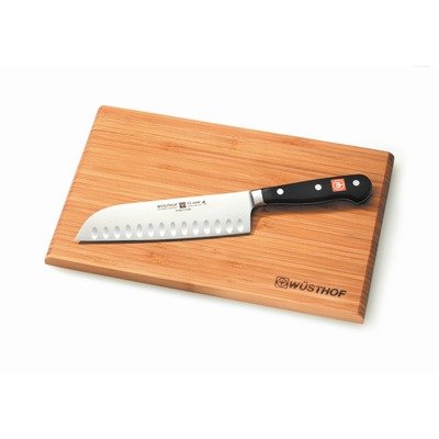 Similar to a butcher knife, the Japanese-style santoku knife is a multipurpose gem for slicing, cubing, or dicing. The distinctive hollow-ground edge that alternates scallops on both sides of the blade, and yields a smooth, clean cut.About Wusthof Classic: Precision-forged blades of Wusthof's own high-carbon, stain-resistant steel alloy, for a lasting edge that is easy to resharpen. Distinctive bolster prevents your hand from slipping onto the blade. Handle is a virtually indestructible composite, buffed by hand for a smooth finish and triple-riveted to the full tang for optimum strength and balance. Dishwasher safe, but hand-washing is recommended. Made in Solingen, Germany.