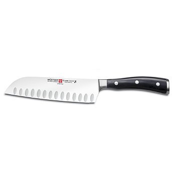 lifetime warranty. Triple riveted full tang construction. Precision forged from a single piece of high-carbon, no-stain, surgical steel. High impact, ergonomic plastic handle. Double bolster for heft and balance. This Wusthof Trident Classic Ikon 7" Santoku knife — or Oriental cook's knife — features a hollow edge ground into the face of the blade. This creates a very fine edge that reduces "drag" and makes this knife perfect for slicing through raw meats, onions, potatoes, and more. Lifetime warranty. . . . . Hand wash only — not dishwasher safe. Made in Germany. This item is ineligible for discounts.