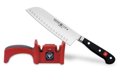 - Wustof Hollow Ground 7" Santoku and Manual Sharpener.