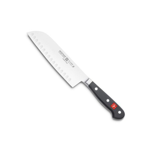 Wusthof classic 6-1/2" hollow forged granton santoku knife styled after the japanese cook's knife, this wusthof classic 6-1/2" hollow forged granton edge santoku knife is perfect for preparing not only fine asian but also western cuisine. use it for cutting fish, vegetables, and boneless or lightly boned meats such as chicken. its hollow edge blade creates pockets of air which prevent extra thin or soft slices from sticking to the blade during use. standard features: wusthof classic 6-1/2" hollow forged granton santoku knife classic collection blade size: 6-1/2" forged from one piece of specially tempered high carbon steel with a stain-resistant alloy buffed by hand and seamlessly attached to a highly durable polymer handle precision handling, the handle features a full tang, triple-riveted design and is contoured with a comfortable grip