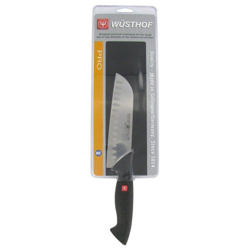 Wusthof pro series 7" japanese santoku knife with granton edge this wusthof pro series 7" japanese santoku knife with granton edge is designed exclusively for the tough day-to-day demands of the commercial kitchen. the granton edge allows for smooth and even slicing as food is less likely to stick to the blade. use if for cutting fish, vegetables, and boneless or lightly boned meats such as chicken. its soft, ergonomic poly handle is one of the most comfortable handles available on the market, effortlessly guiding the high-quality, rust-resistant german steel blade wherever the culinary professional demands. standard features: wusthof pro-series 7" japanese santoku knife length: 7" pro-series collection perfect for cutting fish, vegetables, and boneless or lightly boned meats like chicken the granton edge allows for smooth and even slicing with the granton edge food is less likely to stick to the blade ergonomic poly handle is one of the most comfortable handles available high-quality, rust-resistant german steel blade stamped line of wusthof cutlery designed by chefs, for chefs built to withstand the rigors of everyday use nsf listed hand wash synthetic handle lifetime wusthof guarantee against material and manufacturing defects, with normal use and proper care made in solingen germany model#: 4860-7 6005034