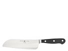 Hard-crusted bread and tough-skinned vegetables are no match for the CLASSIC 6 Santoku Wave Knife. The scalloped, wavy edge gently cuts through skin and crust without crushing the food within. Forged from one piece of specially tempered high carbon stainless steel for exceptional strength. The special steel alloy that comprises the blade assures that it is exceptionally sharp and has a long-lasting, easily restorable edge. The bolster provides heft and balance as well as a finger guard for safety and comfort. Full tang construction from the bolster through the back of the handle for a solid feel and confident control. Riveted synthetic handle is smooth and seamless for a comfortable grip. Attention to details include a ground and polished spine with an etching of the steel formula and trident logo. Carefully hand wash and towel dry. Blade length: 6.0 Blade width: 1.75 Handle length: 4.5 Weight: 5.12 oz. Made in Germany.