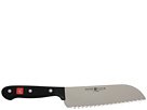 The GOURMET 6 Wave Santoku from Wusthof® has a wavy edge that produces a gentle cut without tearing or crushing food. Offers multiple functions, can delicately cut soft food and slice through tough exteriors. Using state-of-the-art laser technology, the GOURMET series is precisely cut from one piece of steel. The special steel alloy that comprises the blade assures that it is exceptionally sharp and has a long-lasting, easily restorable edge. Riveted synthetic handle with finger guard is smooth and seamless for a comfortable grip. Full tang construction from the blade through the back of the handle for a solid feel and confident control. Carefully hand wash and towel dry. Blade length: 6.0 Blade width: 1.75 Handle length: 4.75 Weight: 4.34 oz. Made in Germany.